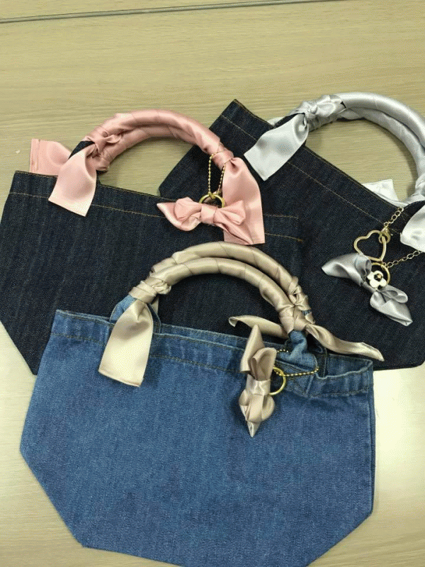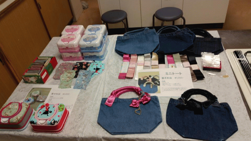 一枚目の写真のミニトートはピンクとベージュのリボンのものが基本で作って頂くもので、材料費、講習費込みで¥1,000円