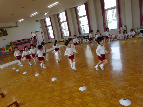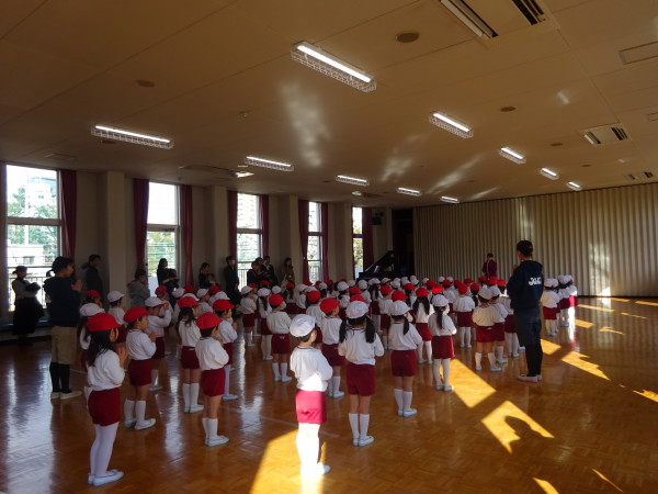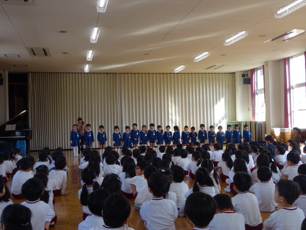 年少組みんなが遊戯室に集まり、合同朝礼をしました。