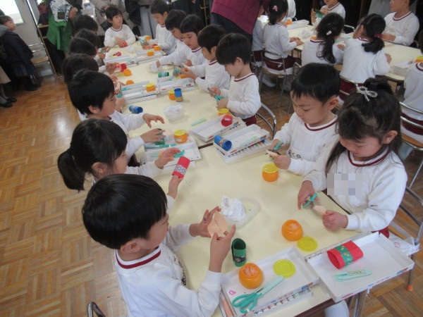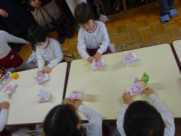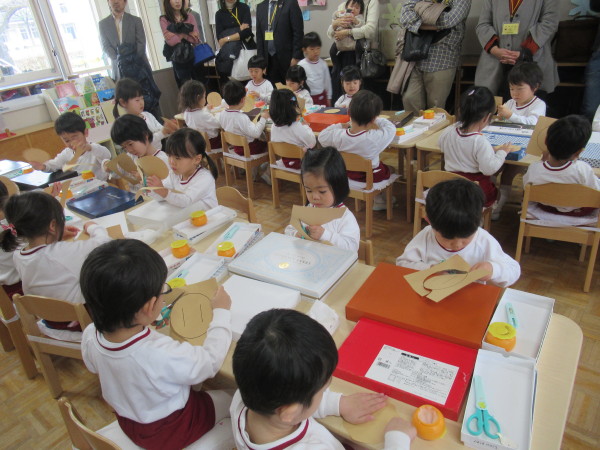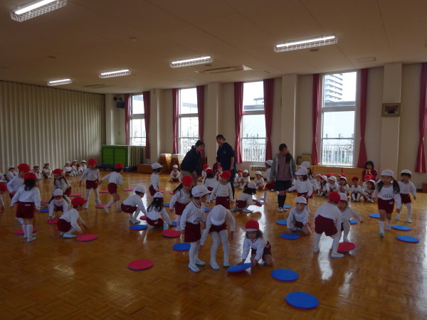 年中組の園開放2日目は、体育と紙制作「ももたろう」を見て頂きました。