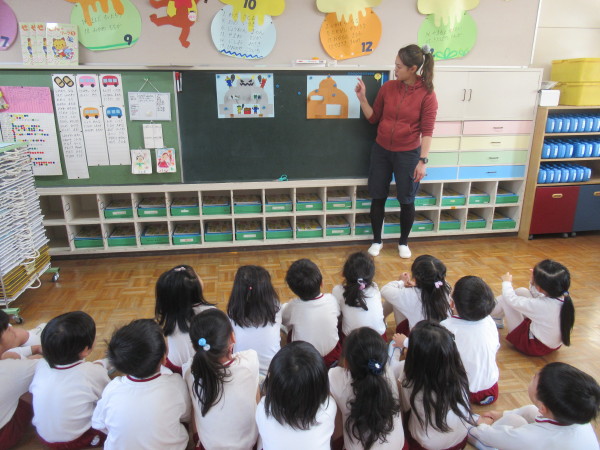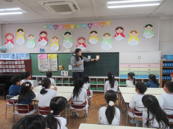 英語では、新しい歌やゲームをして、楽しみながら英単語を覚えていきます。