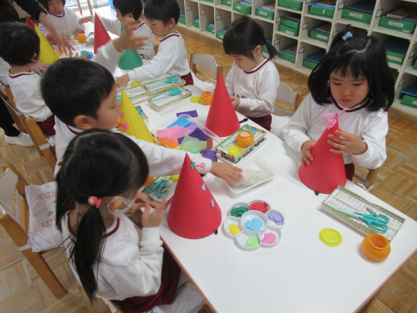 まずは、おたすけこびとに変身するために、自分たちで帽子に飾り付けをしました!