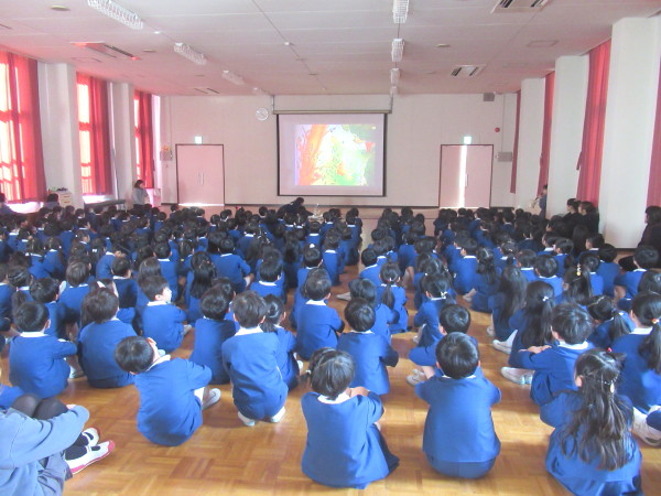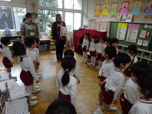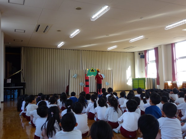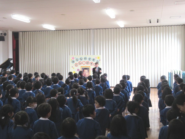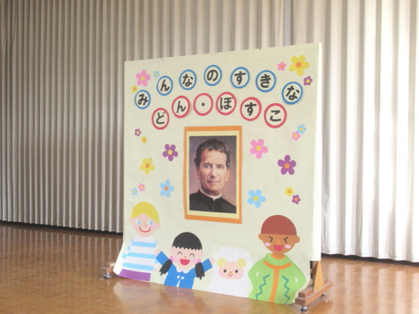 今日は、遊戯室にみんなが集まって、城星学園幼稚園の創立者であるドン・ボスコのお祝いをしました。