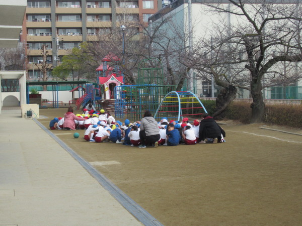 今日は、事前に知らせずに行う地震の避難訓練を朝の自由遊びの時に行いました。