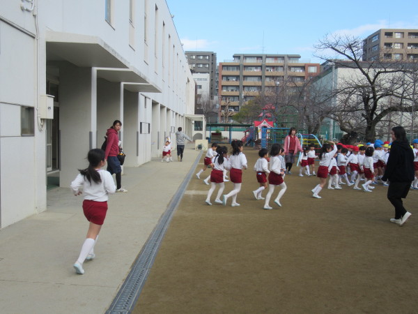 遊んでいるときに急にサイレンが鳴り、驚く子どももいましたが、先生の話をしっかり聞いて無事に避難する事ができました!!