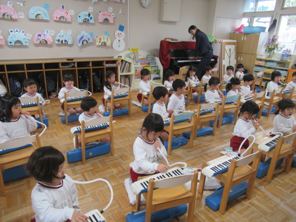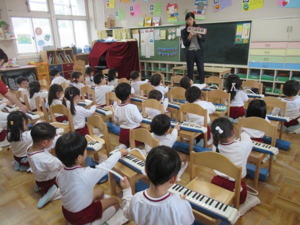 その後、先生が鍵盤ハーモニカで色々な曲を弾いて、どんな音が出るのかをみんなで聞きました☆