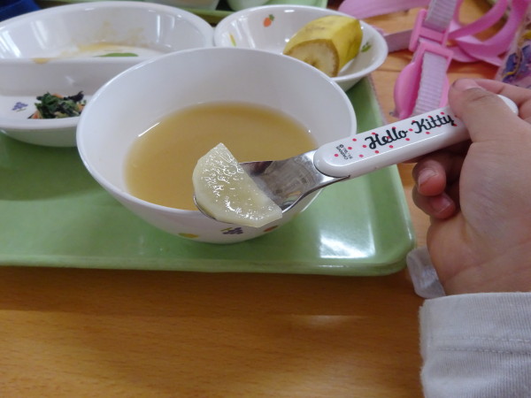 お味噌汁の中に大根を見つけた子どもたちは、嬉しそうに「見てみて!大根入ってたよ〜♪」と見せてくれました!