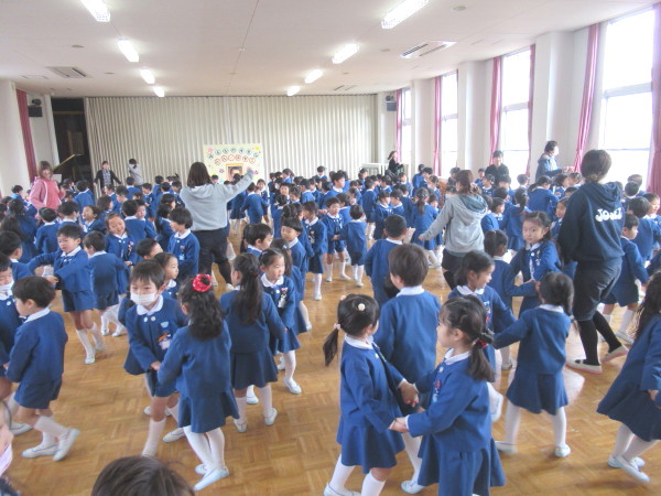 違う学年やクラスのお友達と一緒に手を繋いで、音楽に合わせて踊る子どもたち!