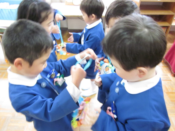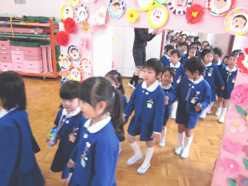 最後は年中組・年長組が向かい合わせに立って、道を作ってくれて、拍手で年少組をお見送りです☆