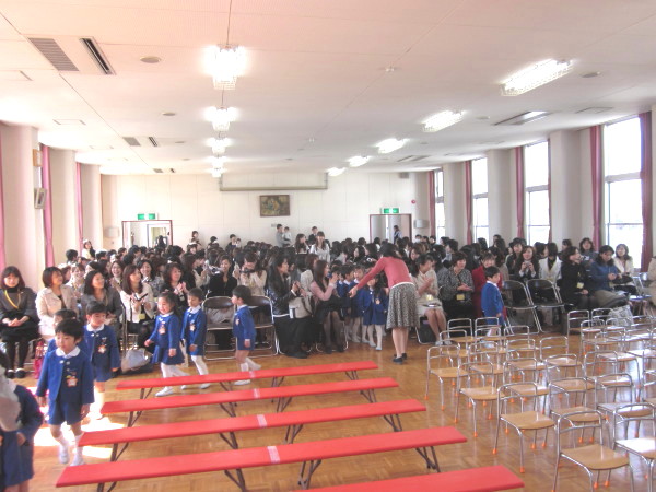 講堂に新入園児の子ども達と、お家の人。そして、在園児代表として参加している、年長組のこどもたちが着席。
