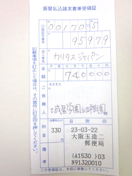 玉造郵便局にて、振り込みをしてきました。