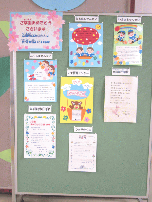 たくさんの方からのお祝いのメッセージが、卒園式を迎えたみんなをあたたかく見守ってくれていました。