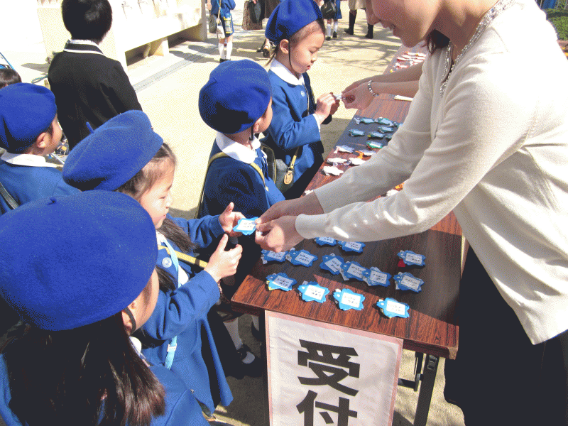 名前を先生に言って、名札をもらいます。