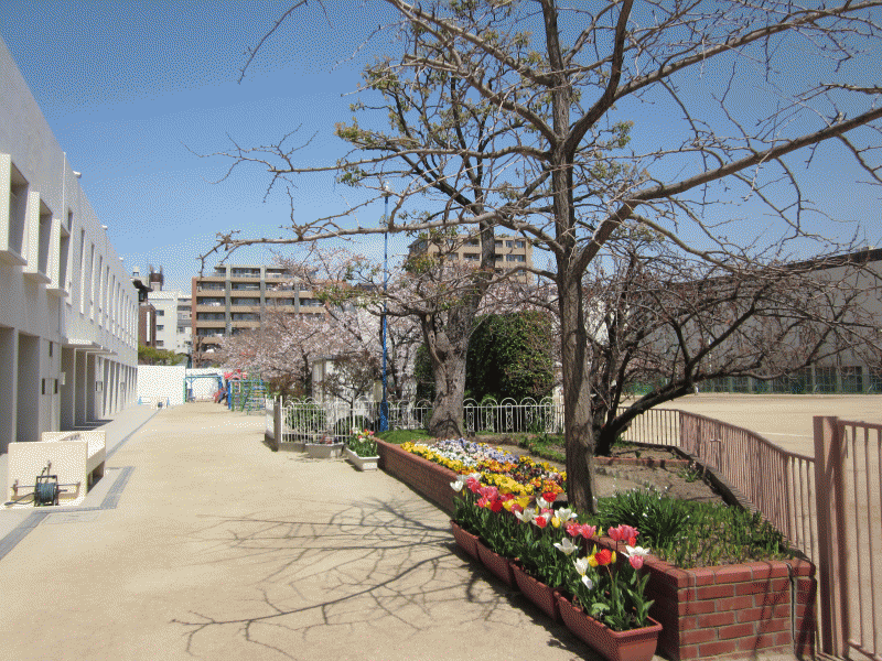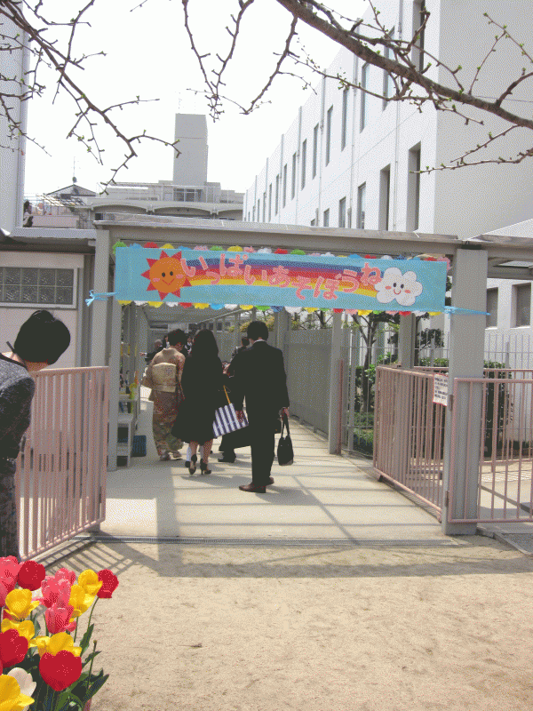 門の所には、3月に卒園した年長組が植えたチューリップが、きれいな花を咲かせ、園庭には、桜の花が週末の雨にも散らずにきれいに咲いて、新入園児をお出迎え♪