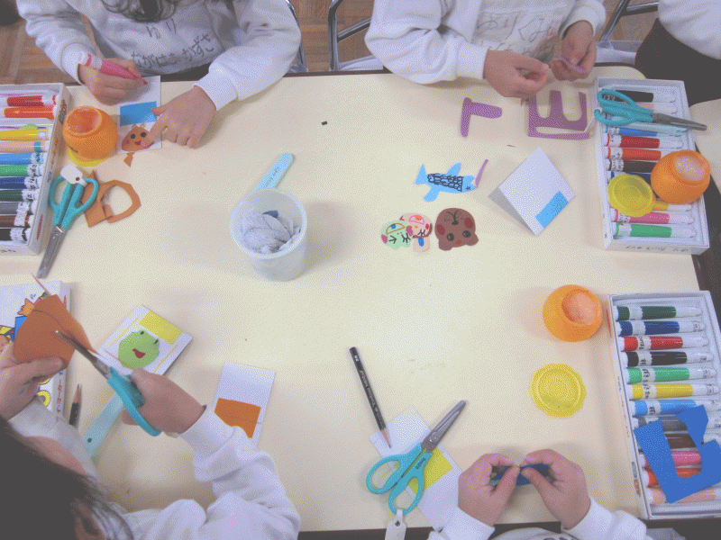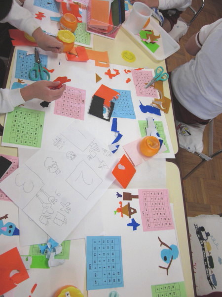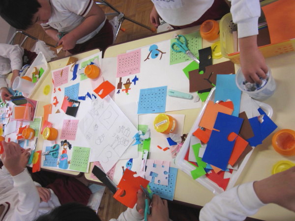 「どんなカレンダーを作ろうかな…」と事前に設計図を作り、イメージを膨らませていた子どもたちは、器用に折り紙を切って、いろいろなモチーフを作っていきます☆