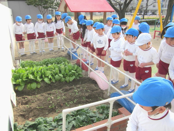 去年、園庭の片隅と、芋畑の後にまいた、野菜の種がグングン伸びて