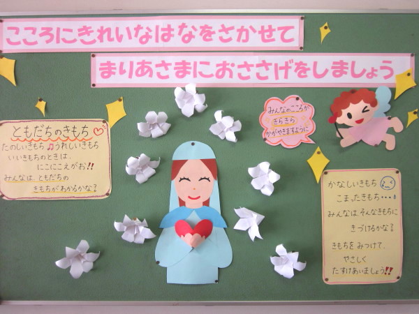 各クラスで、徳の花を表していますが、1階ホールにマリア様を飾り、その周りに徳の花をゆりの花に表して、毎日一つずつ咲かせていくことも共にしてきました。