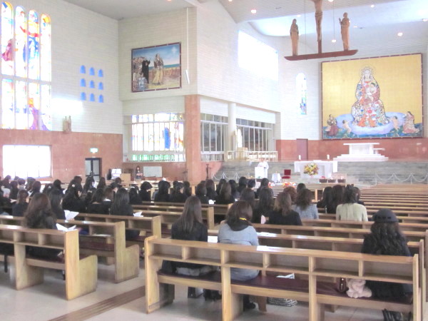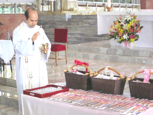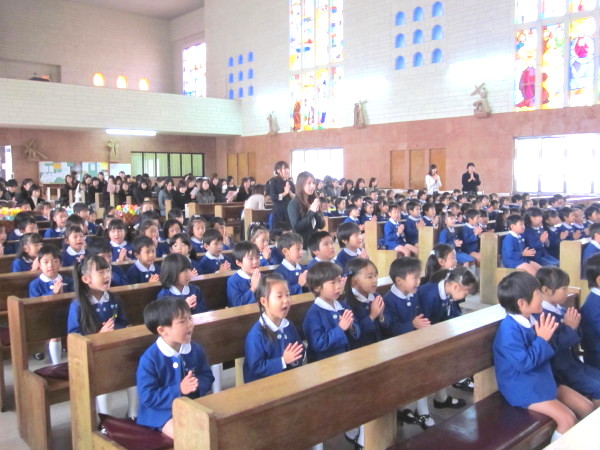 ひとりずつ、神父様におめだいを掛けてもらい、先生から記念の飴を頂きました。