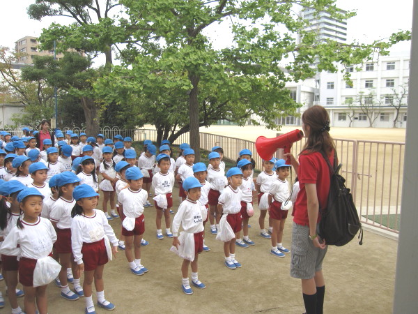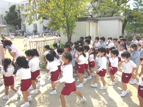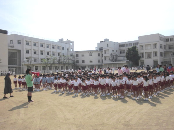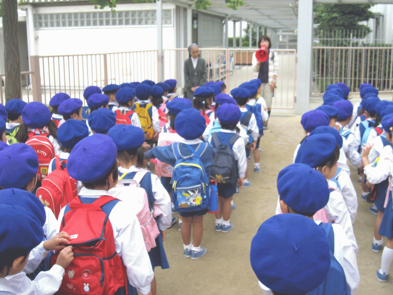 グランドに避難した後は、クラスの先生の