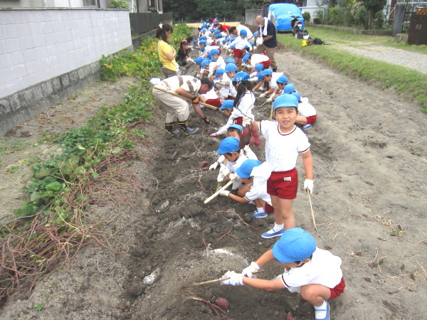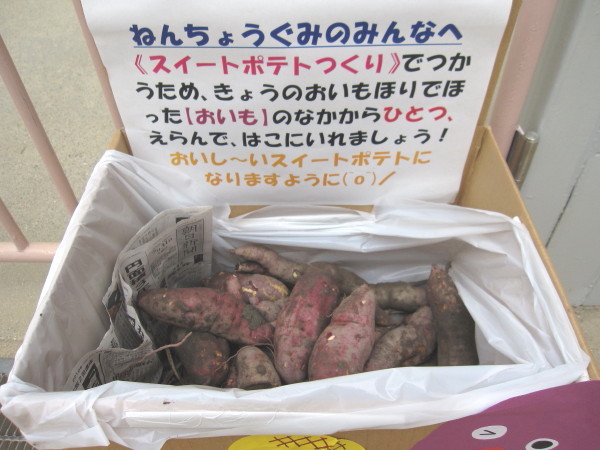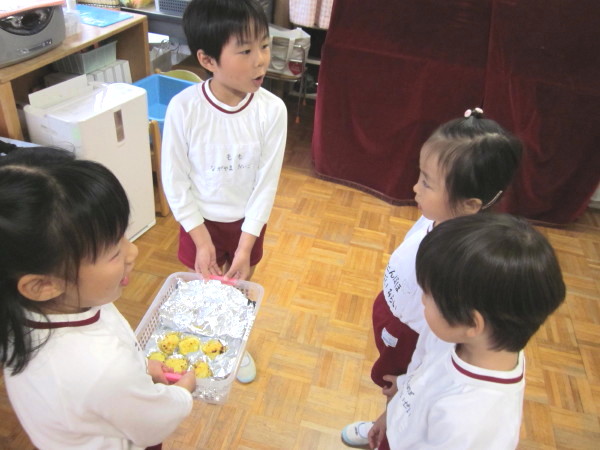 今日は、芋掘り遠足でとってきたお芋と、年中組さんが幼稚園の畑で掘った