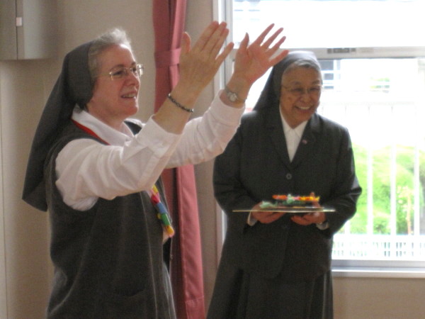 シスターも拍手をしながら、遊戯室に入って来られました。