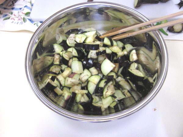 うめぐみの部屋にまな板とナイフを持ってきて、なすの浅漬けを作りました。