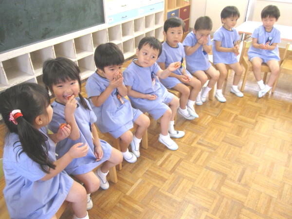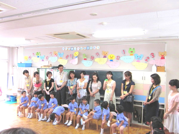 年少組さんは、園生活に慣れてきたとはいえ、まだまだ保護者の方達で、知らない方や、バス利用のため顔を合わす機会も少ないという方もおられるので、自己紹介の場を設けました。子ども達も紹介されて照れくさそう・・・・・(*^。^*)