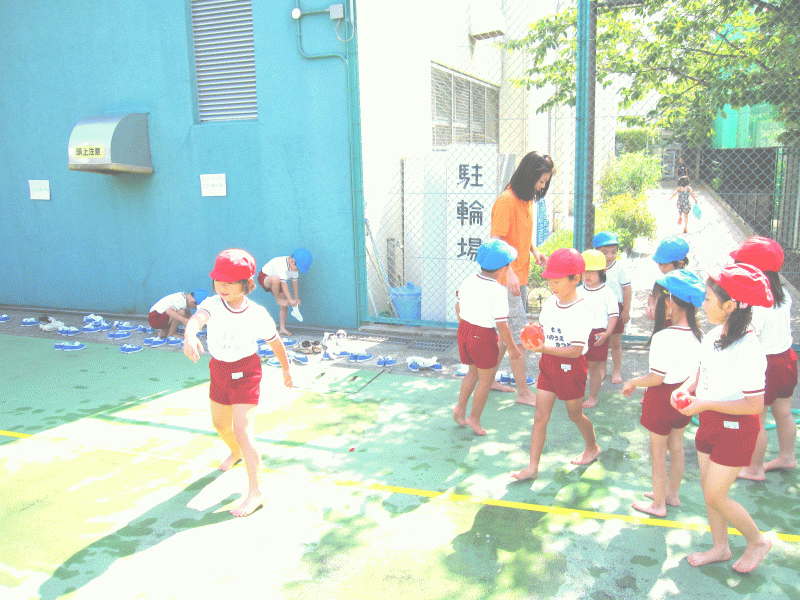 裸足で、水を掛け合ったり、風船を持って元気に走り回る様子は、とても気持ちよさそうですね(^v^)