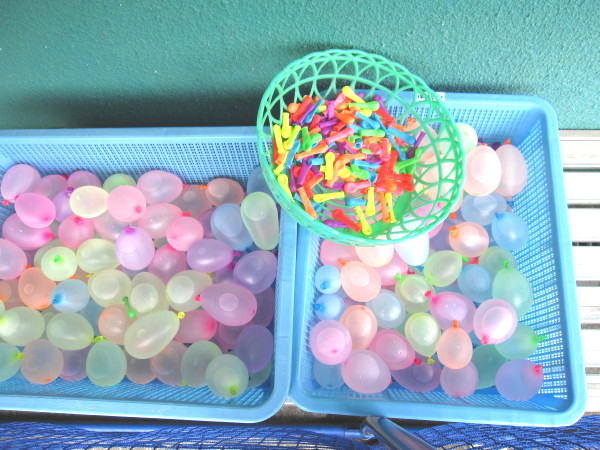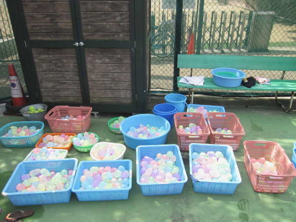 これは、大量の水風船です。先生達がひたすら前日に作って用意しましたが、投げ合い合戦になると、あっという間になくなるので、年長組さんにも手伝ってもらいました。