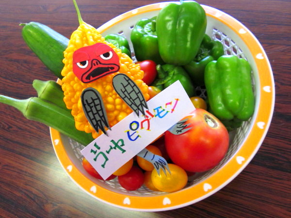 【幼稚園で収穫された夏野菜と、熟れ過ぎたゴーヤでできたピグモン・8/6撮影】