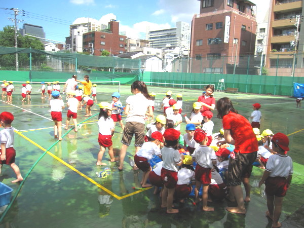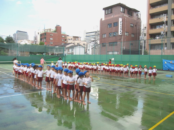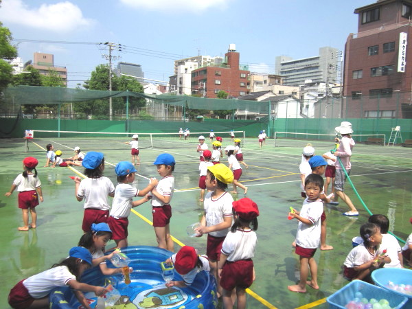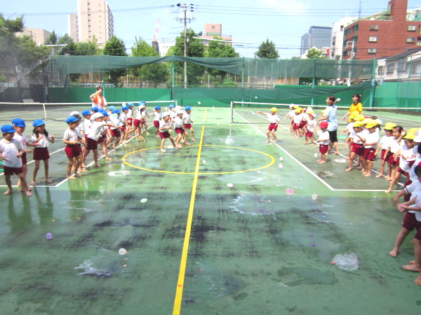 中高のテニスコートをお借りして、みんなで思い切り水遊びを楽しみました。