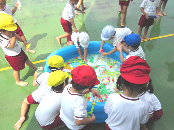 さて、水遊びでは、他にも的あて遊びや、水の掛け合いっこを予定しています。