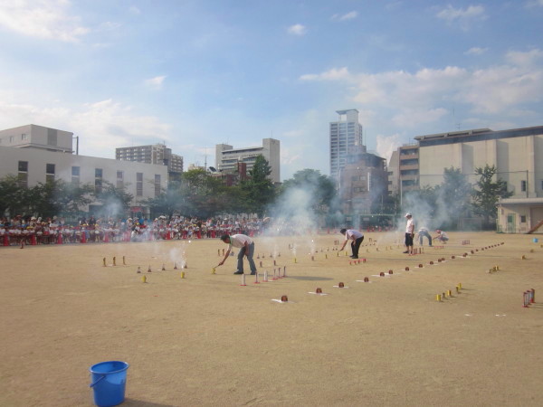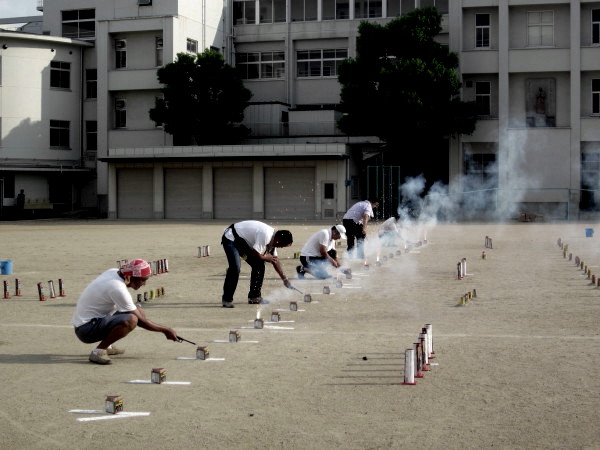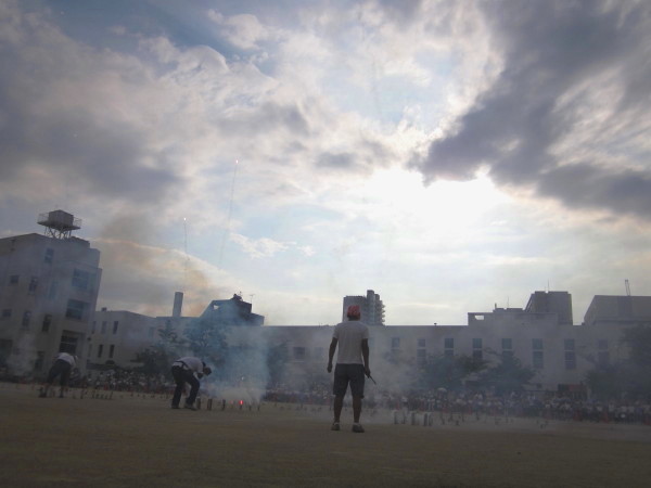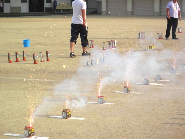 花火の音と共に、火の粉が頭上に落ちるなど、危険な作業を黙々とこなしているお父様方の背中です。・・・お疲れさまでした。