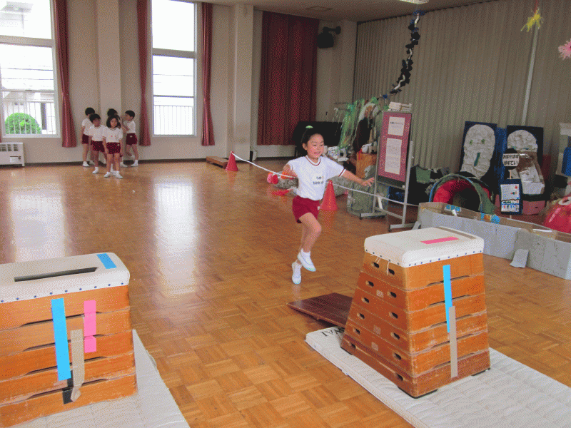 何度も跳ぶ内にコツが掴めたようで、今日のミックス保育の間に跳べる様になった子もいましたよ♪