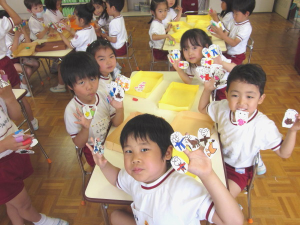 一日目は、製作遊びの『指人形作り』をしました。この日までに読み聞かせた「ブレーメンの音楽隊」、「おおかみと7ひきのこやぎ」、「大きなかぶ」の中からお気に入りを一つ選んで、登場人物などを作ります。