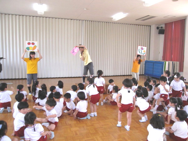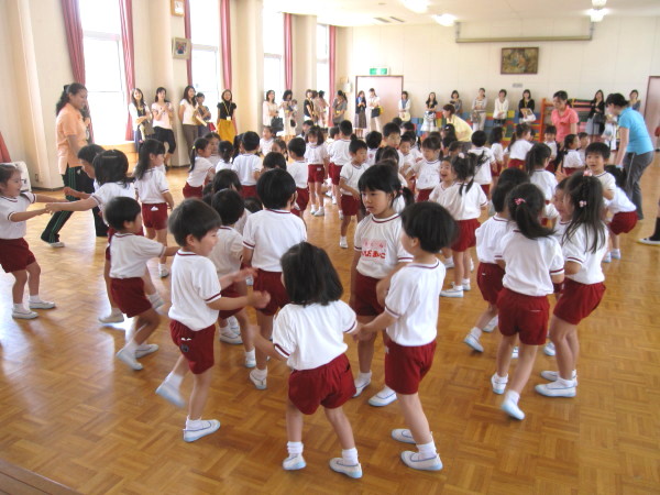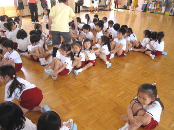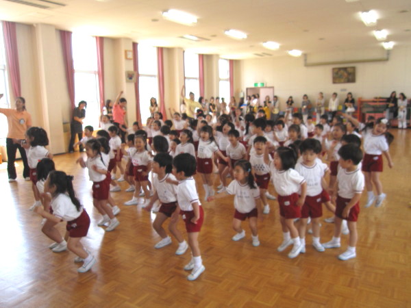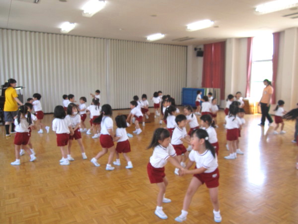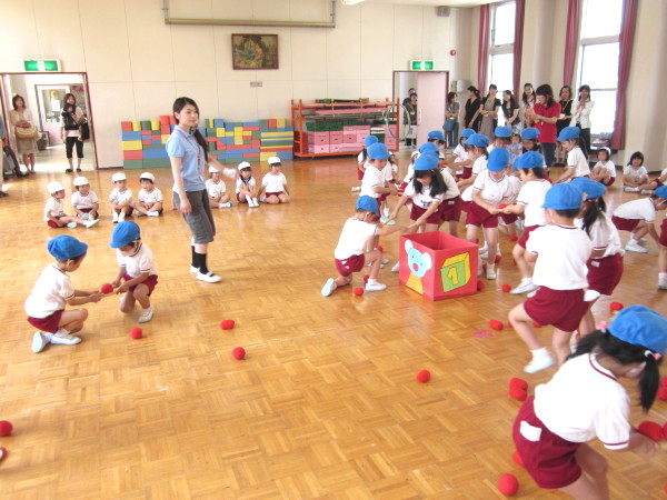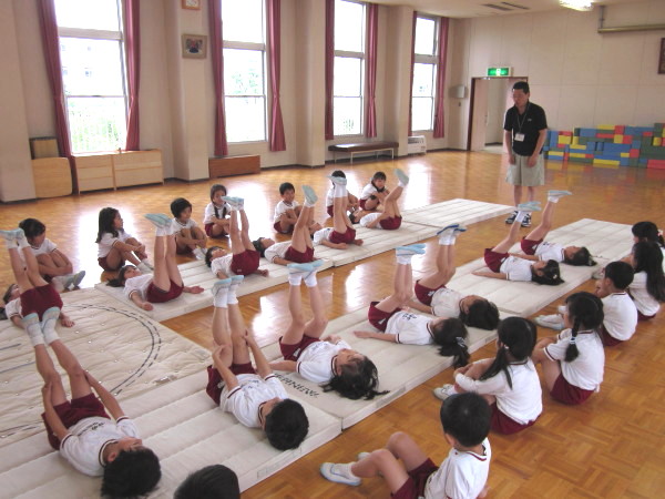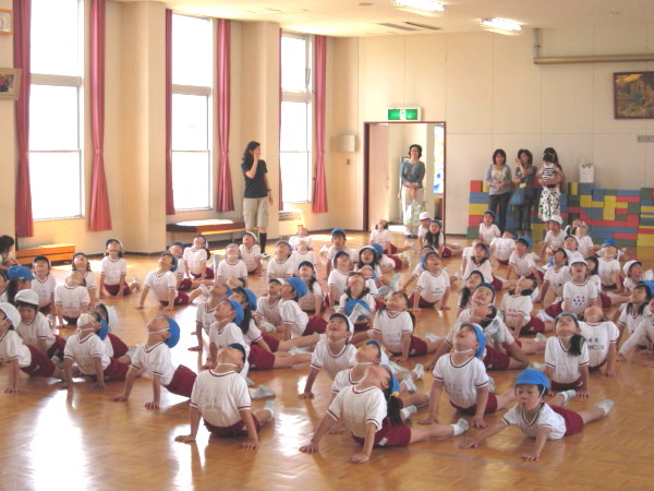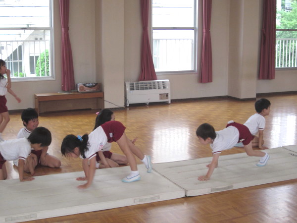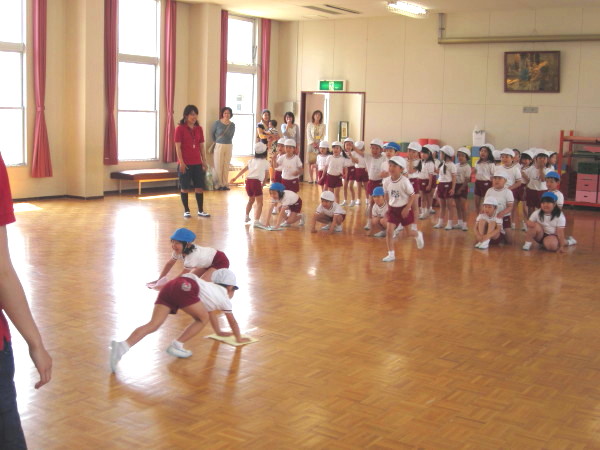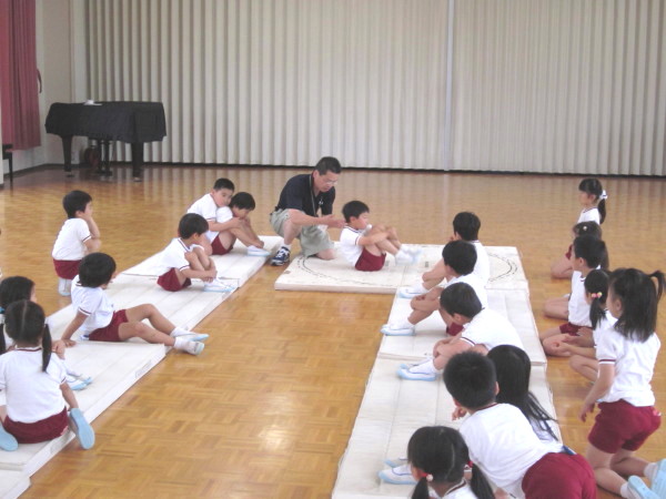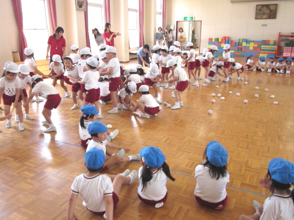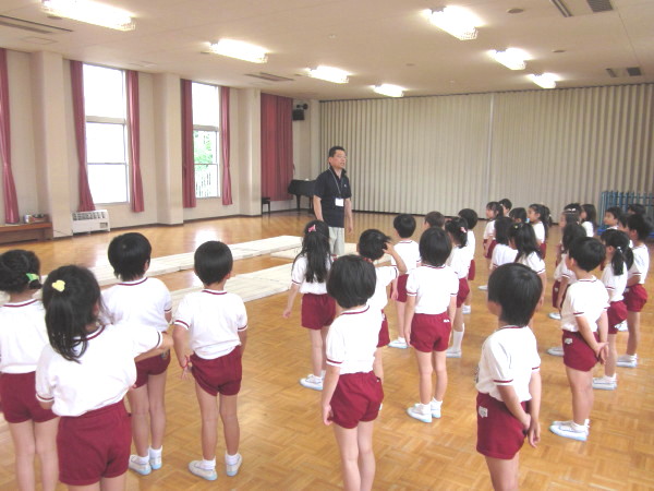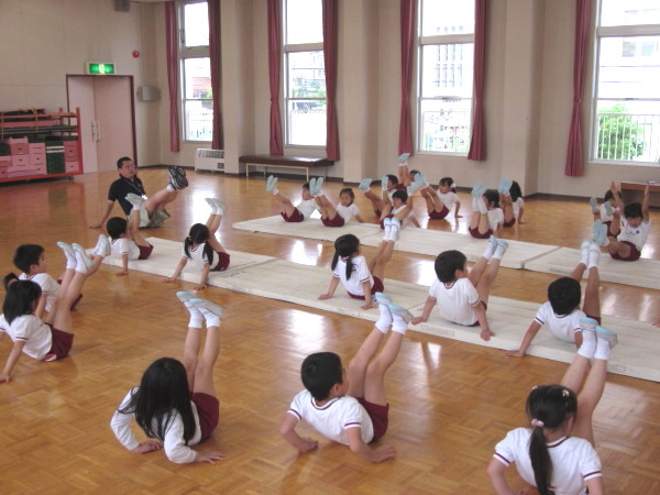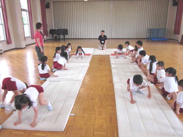 英語指導、歌唱指導に続き、年長組では、新たに体育指導が