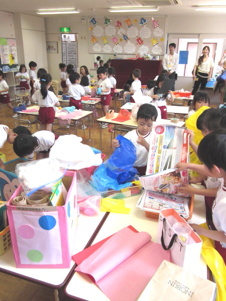 あらかじめ、考えてきたおばけの設計図をもとに、色々な素材の使い方や、方法など説明を聞き、「あそこは何を使おうかな・・・?」と、どこにどんな素材を使うかを考えます。