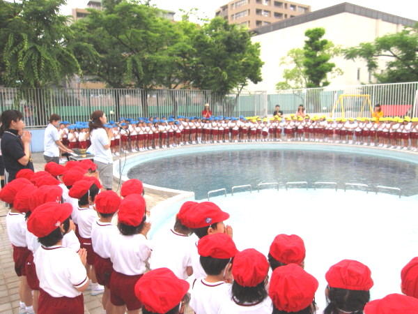 「楽しく遊ぶためにもプールのお約束を守って、水を大切にしながら遊びましょう。そうすると、水も優しくみんなのことを包んでくれます。怪我のないように、安全に楽しく遊びましょうね。」 と、お話がありました。