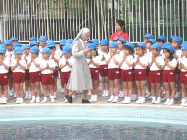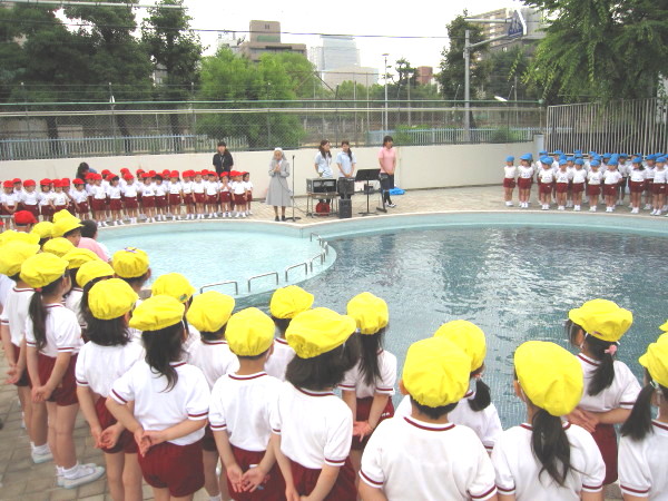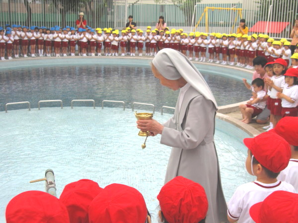 その前に、子ども達が安全に水遊びを楽しめるように、神様にお祈りをし、プールのお水を祝福していただく【プール開き】を行いました。