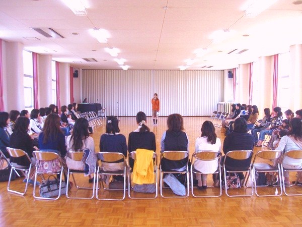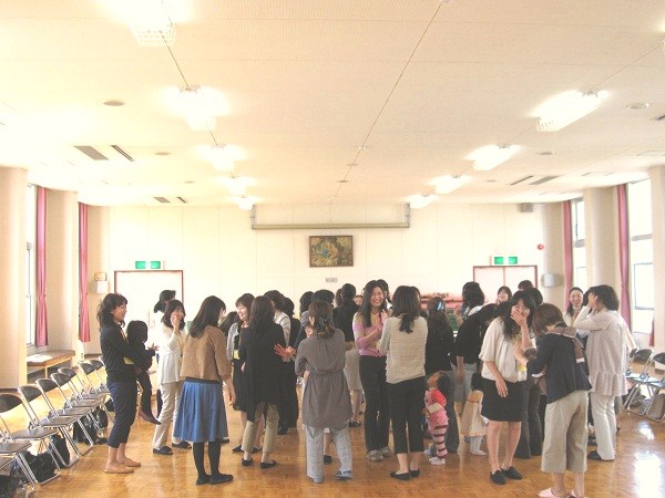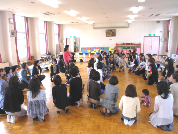 遊戯室に、年長組のお母様方が集まって、「母の集い」が行われました。