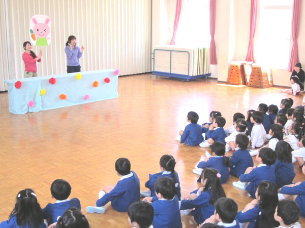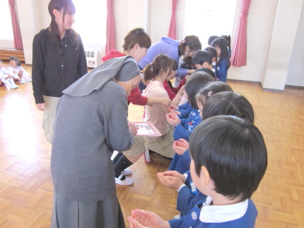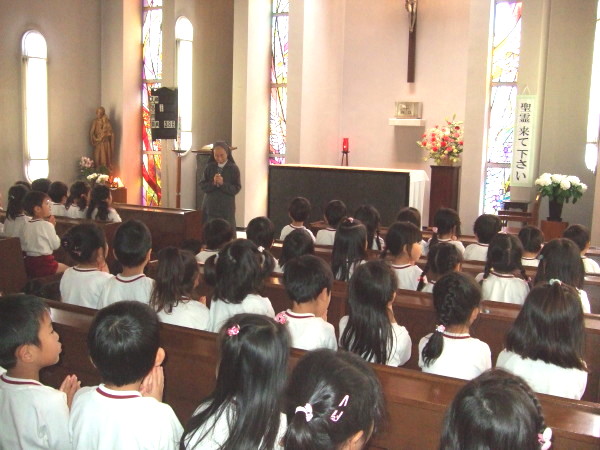 お祈りをして園長先生から神様のお話を聞いたりします。