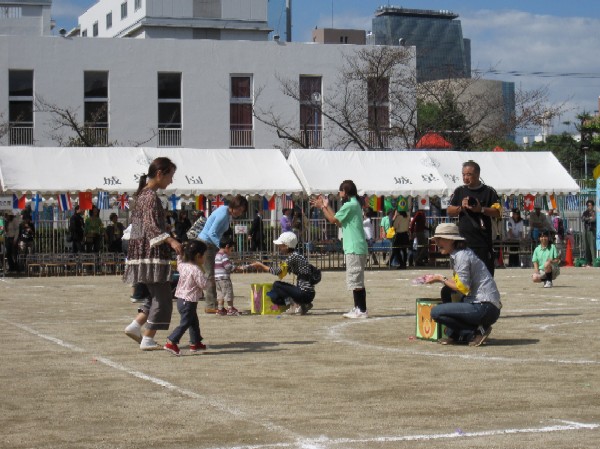 ボールを投げ入れて、次のお父さんにバトンタッチするゲーム。