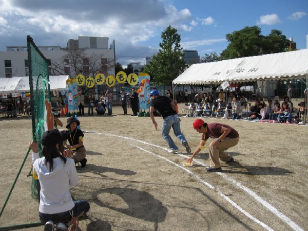 毎年、注目のお父さん競技。今年は、ネットの中に
