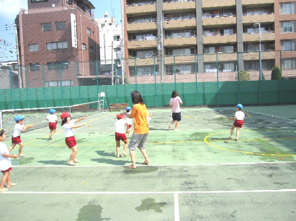 お隣のテニスコートを借りて、色んな水遊びができます。