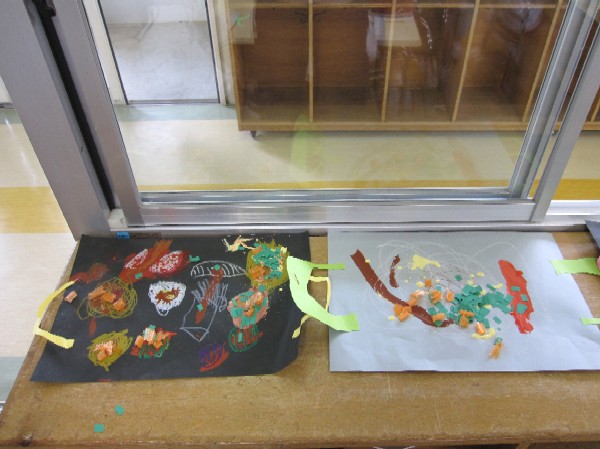 「ぼくは、のりをつけていくから、そこにはって〜!」