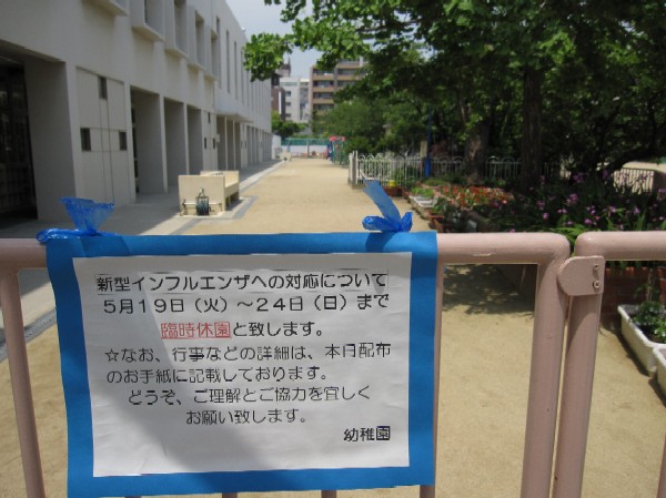 新型インフルエンザが近畿一円に拡大しつつあります。大阪府においても感染者が出たことを踏まえ、また本園が総合学園であることも考慮に入れて、下記の措置をとることとなりました。保護者の皆様にはご理解とご協力を下さいますようお願い致します。