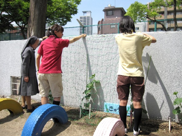 年長組の先生達は、つるが延びてきたキュウリに