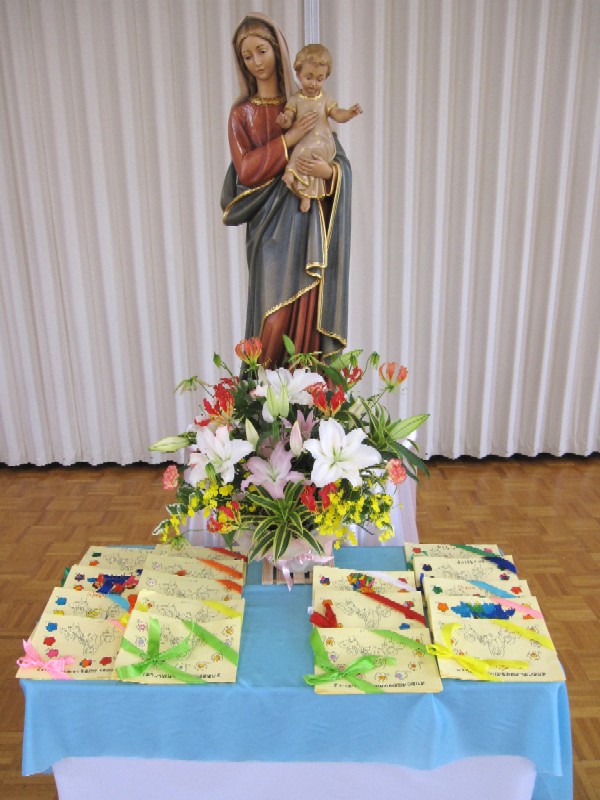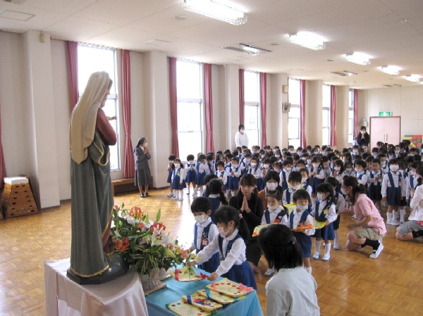 これまで子ども達が準備してきた徳の花をマリア様におささげ
