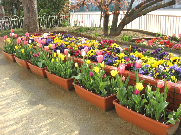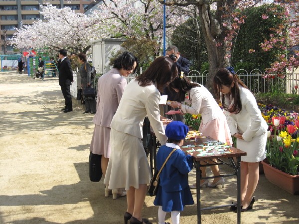 幼稚園に着くと、園庭のチューリップと桜の花が