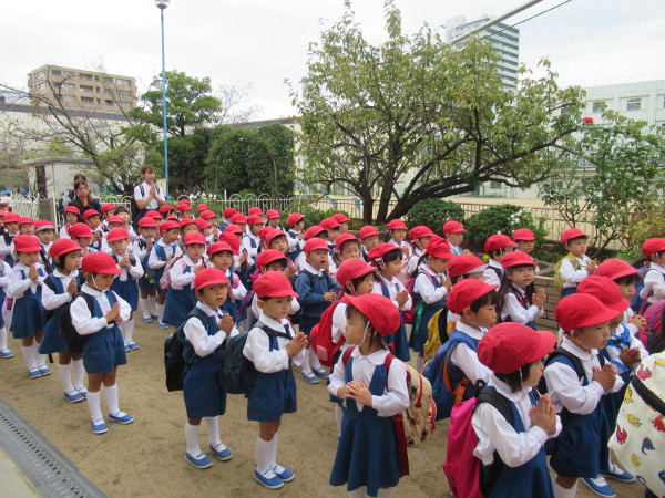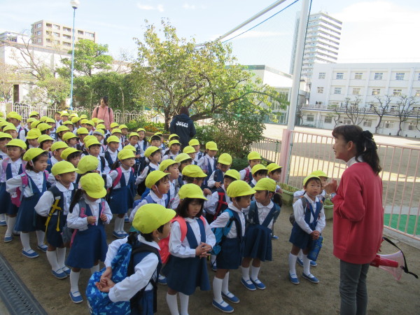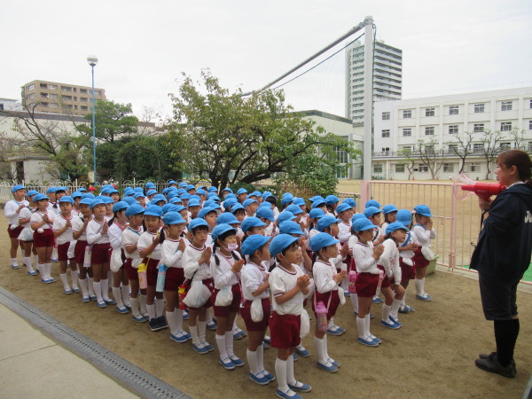 準備ができたら、園庭でお祈りをして園長先生からお話をいただいて出発です。