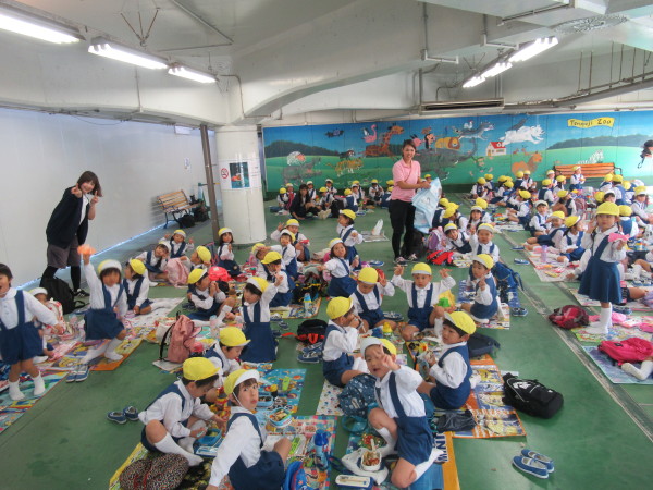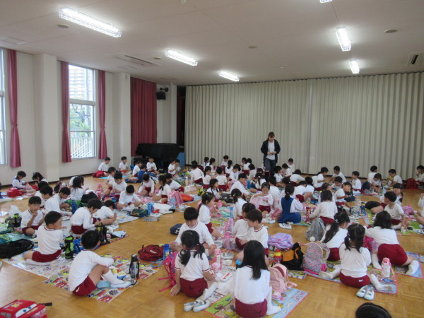 残念ながら雨が強くなってきたので、芋ほりのあとは幼稚園に帰って、年長組みんなで遊戯室でお弁当を食べました☆